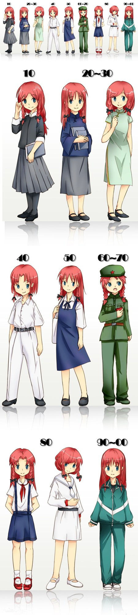 由于上個十年的審美口味余溫未消,所以在校服在設(shè)計上參考了很多“軍事元素”。黃軍裝太土、迷彩服太雜、一身白的空軍裝扮不耐臟,于是白襯衫和天藍(lán)色褲子和背帶裙的模仿海軍軍裝的校服應(yīng)運(yùn)而生。不過,這個時候的校服也還是雜亂無章的,沒有統(tǒng)一的標(biāo)準(zhǔn)、沒有規(guī)范的樣式,每個學(xué)校都有自己的“審美”。