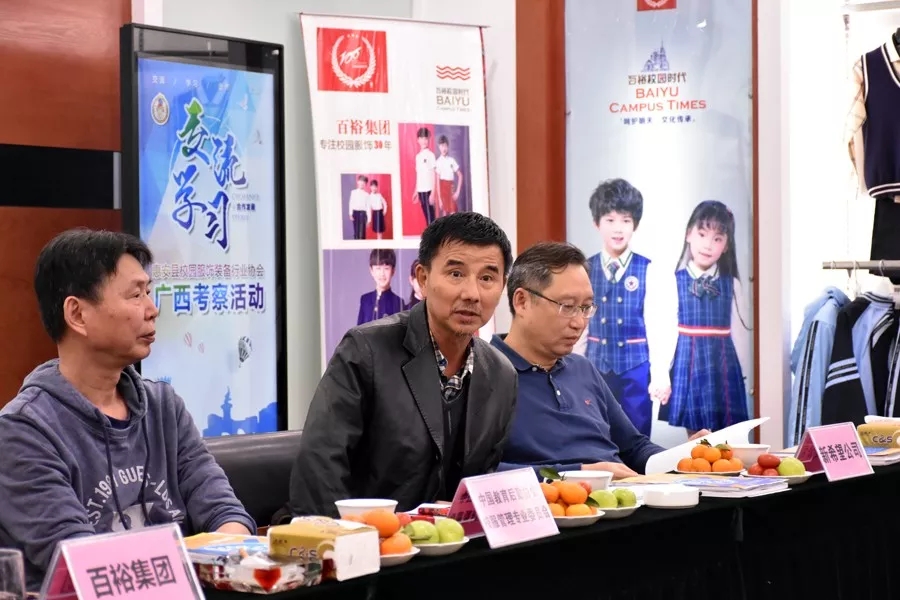 考察團(tuán)邀請(qǐng)到中國(guó)教育后勤協(xié)會(huì)校服管理專業(yè)委員會(huì)副主任金堅(jiān)兵、南寧市新希望教育用品有限責(zé)任公司總經(jīng)理勞豪參與交流會(huì),在交流會(huì)中,分別對(duì)校服協(xié)會(huì)會(huì)員企業(yè)的經(jīng)營(yíng)與管理提出建議與思路、分享經(jīng)驗(yàn)。