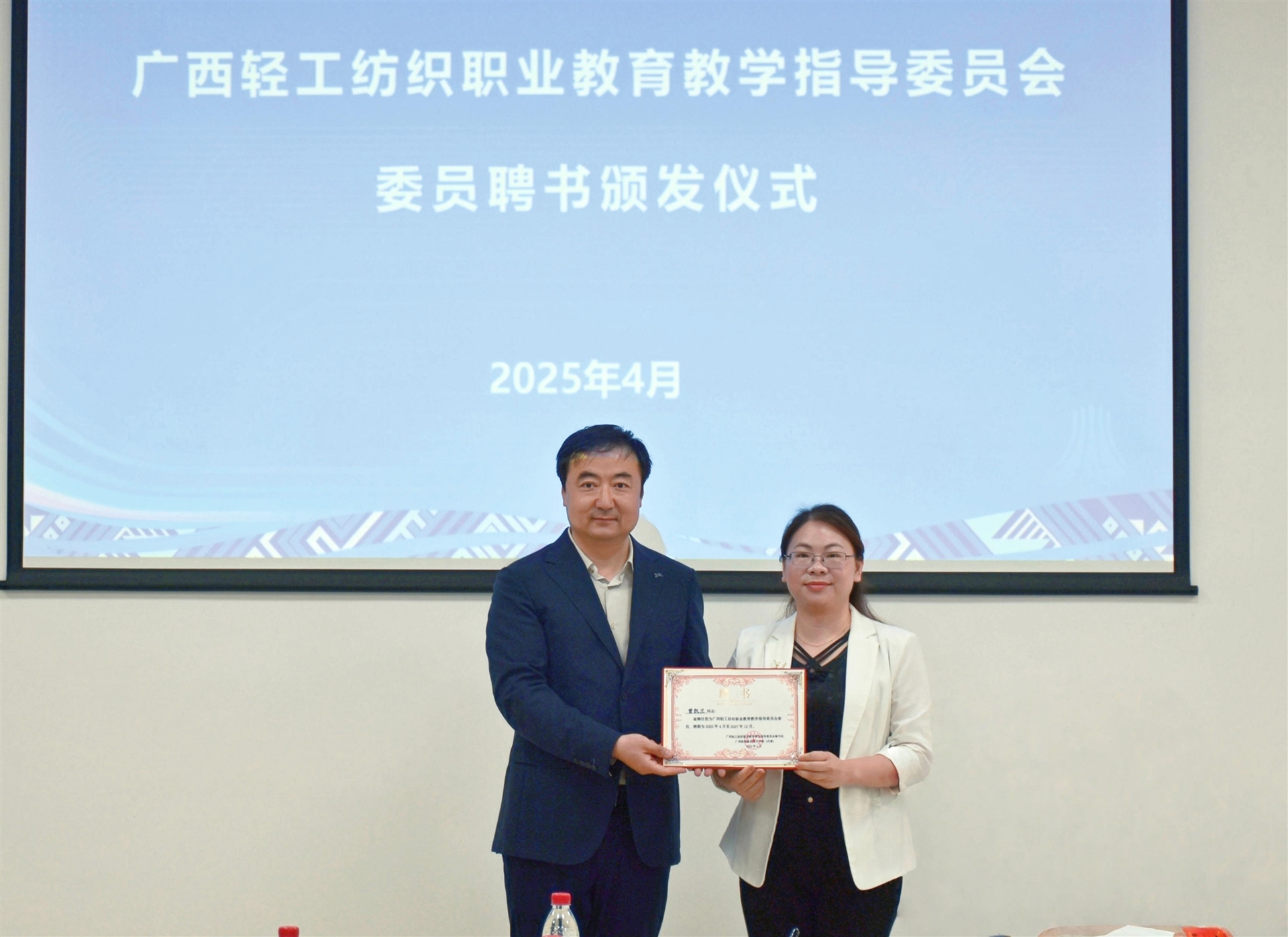 隨后,中國紡織服裝教育學(xué)會(huì)會(huì)長紀(jì)曉峰為百裕集團(tuán)等委員代表頒發(fā)了廣西輕工紡織職業(yè)教育教學(xué)指導(dǎo)委員會(huì)委員聘書。