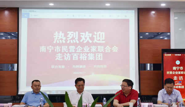 南寧市民營企業(yè)家聯(lián)合會始建于1992年4月,是南寧市成立最早的商會之一。會員行業(yè)涵蓋房地產(chǎn)開發(fā)、融資擔(dān)保、建材、制造、礦業(yè)、餐飲、農(nóng)業(yè)、五金機電、商貿(mào)物流等多個行業(yè),市場已拓展到美國、加拿大、日本、韓國、東盟各國等地。百裕集團董事長許曲煌做為聯(lián)合會執(zhí)行會長,認真履行會員企業(yè)的義務(wù)和工作,積極與企業(yè)會員企業(yè)交流學(xué)習(xí)。此次走訪活動中,各企業(yè)家參觀了百裕集團產(chǎn)品展示廳、觀看了集團各分公司、生產(chǎn)中心、研發(fā)中心等相關(guān)視頻短片,并在會議室進行了交流會議。