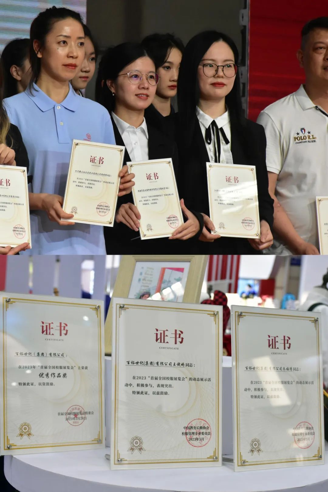 在首屆全國校服展覽會校服作品展演活動中,百裕世紀(jì)(集團)作品榮獲了“優(yōu)秀作品獎”榮譽,研發(fā)中心王旋嬌、朱梅清兩位設(shè)計師也獲頒榮譽證書。