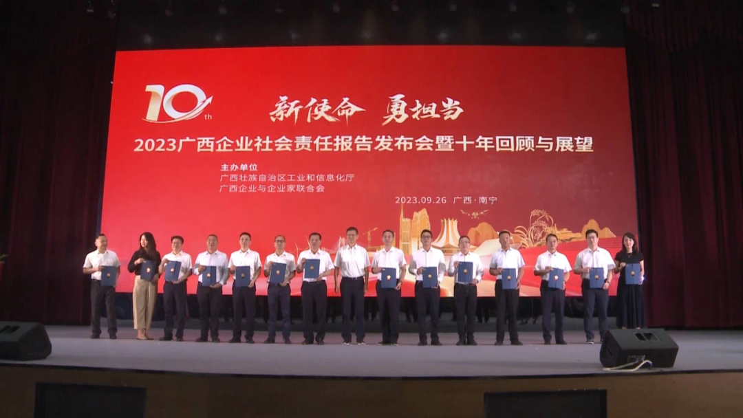 為深入學習貫徹黨的二十大精神及習近平總書記關(guān)于企業(yè)社會責任建設(shè)的重要指示精神。2023年9月26日下午,由廣西壯族自治區(qū)工業(yè)和信息化廳、廣西企業(yè)與企業(yè)家聯(lián)合會共同主辦的“2023廣西企業(yè)社會責任報告發(fā)布會暨十年回顧與展望”活動在南寧隆重舉行。廣西區(qū)各大國企央企以及各行業(yè)代表企業(yè)包括百裕集團在內(nèi)的近百家企業(yè)齊聚一堂,向社會展示了廣西企業(yè)2022年度履行企業(yè)社會責任實踐取得的主要成果。會上,百裕集團獲頒廣西企業(yè)社會責任報告發(fā)布證書。