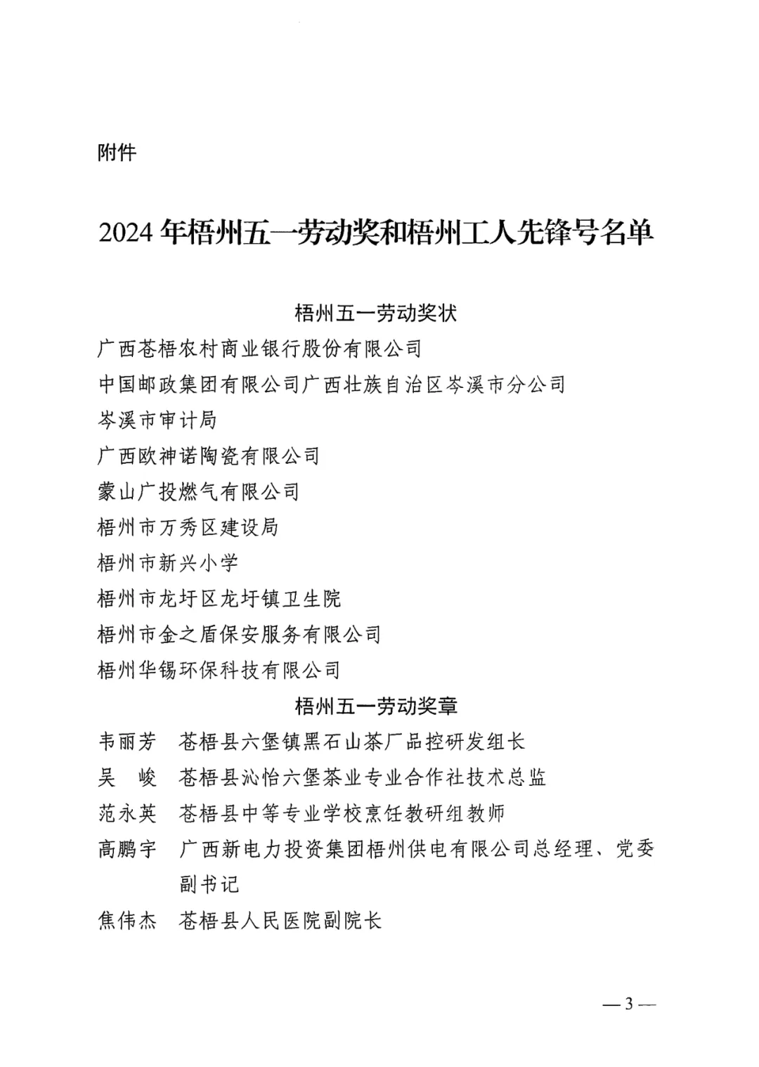 4月26日,梧州市總工會(huì)印發(fā)《梧州市總工會(huì)關(guān)于表揚(yáng)2024年梧州五一勞動(dòng)獎(jiǎng)和梧州工人先鋒號(hào)的通報(bào)》,百裕世紀(jì)(集團(tuán))有限公司羅獻(xiàn)鳳同志榮獲2024年“梧州五一勞動(dòng)獎(jiǎng)?wù)隆薄?/span>