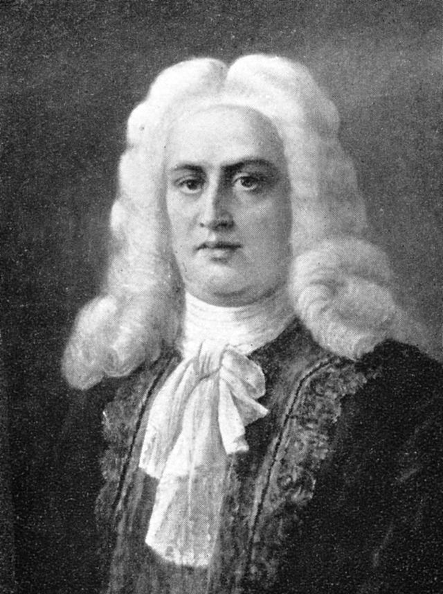 插畫,德國作曲家喬治·弗里德里?!ず嗟聽?/span>(1685-1759)。這個(gè)時(shí)期領(lǐng)帶的樣式在法朗士小說《領(lǐng)帶》中可見 :" 他的暗綠色上裝的領(lǐng)子豎得很高,他穿著一件南京紫花布背心,黑綢子寬領(lǐng)帶在他的頸子上繞了三圈。"