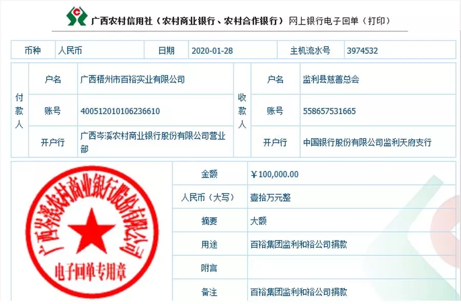 (向監(jiān)利縣慈善總會捐款壹拾萬元)