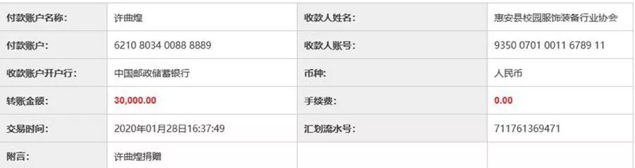 許曲煌董事長作為惠安校園服飾裝備行業(yè)協(xié)會會長,牽頭組織惠安校服協(xié)會共有132名會員企業(yè)家、群友,通過協(xié)會賬戶主渠道捐資520500元,通過其他渠道捐款的數額也將近20萬元。協(xié)會所募抗疫捐資,已轉40萬元到惠安縣慈善總會戶頭。其余的,根據有關部門意見,留待購買應急防控醫(yī)用物品,或隨時聽候縣防控指揮部調用。目前,后續(xù)的捐款還在進行中。