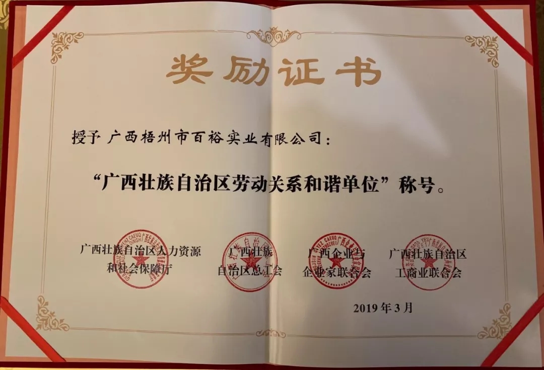 近日,百裕集團(tuán)先后榮獲“廣西壯族自治區(qū)勞動關(guān)系和諧單位”、2018年度廣西壯族自治區(qū)“守合同重信用”企業(yè)稱號。