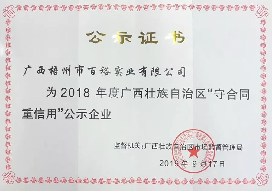 10月25日,百裕集團(tuán)獲得自治區(qū)市場監(jiān)督管理局授予的2018年度廣西壯族自治區(qū)“守合同重信用”公示企業(yè)稱號,并授予獎牌和證書。百裕連續(xù)多年獲此殊榮,這是主管部門對百裕在誠信經(jīng)營、體系建設(shè)以及維護(hù)合同信用等方面的充分肯定與認(rèn)可。公司始終堅持誠信經(jīng)營、堅守品質(zhì),樹立良好的口碑和企業(yè)形象