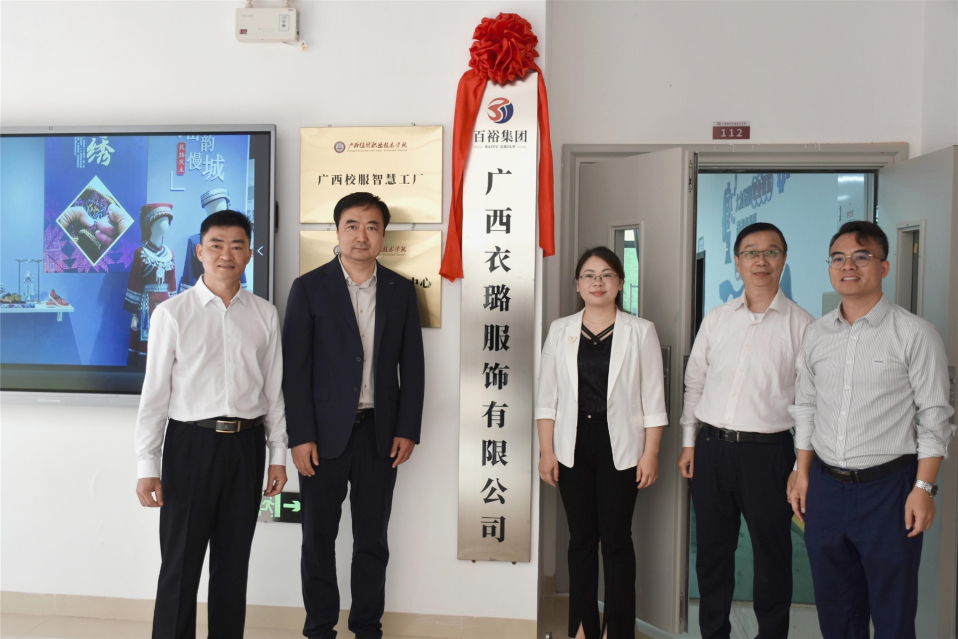中國紡織服裝教育學會會長紀曉峰、廣西經(jīng)貿(mào)職業(yè)技術(shù)學院校長羅生芳、副校長林震、藝術(shù)設計與建筑學院副院長蔣衛(wèi)軍與百裕集團市場總監(jiān)曾凱蘭共同為產(chǎn)業(yè)學院揭牌,現(xiàn)場掌聲雷動,標志著雙方在產(chǎn)教融合領域邁出了具有里程碑意義的一步。
