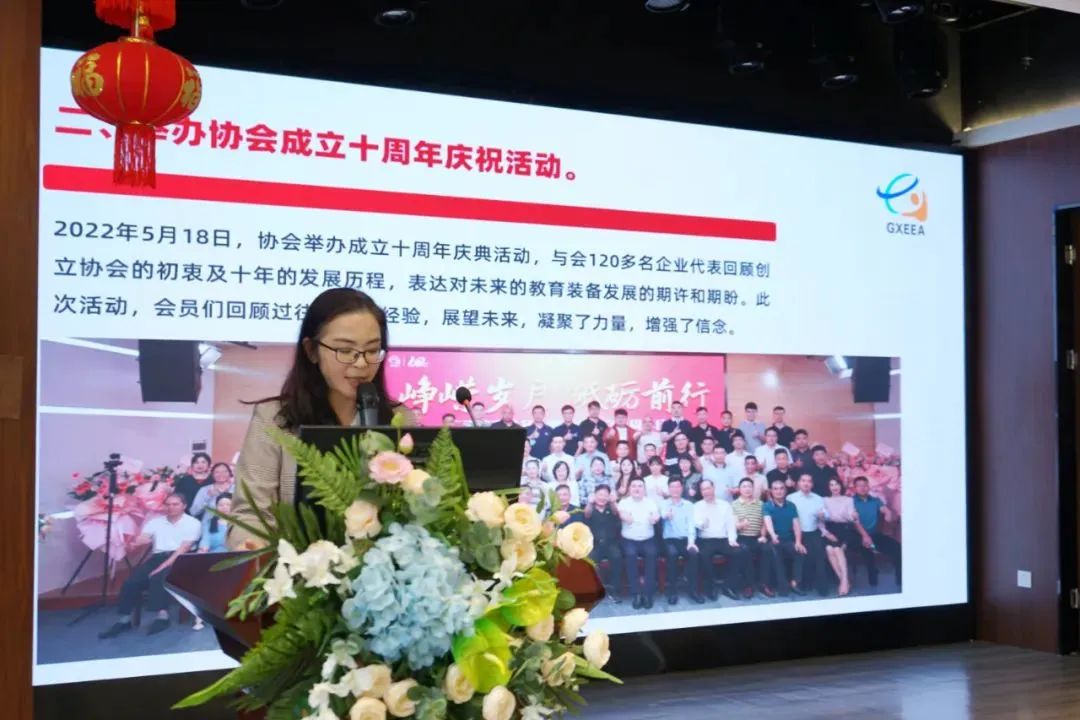 張珊會長對協(xié)會2022年工作情況進行了總結匯報。2022年協(xié)會密切關注國家大事,堅定不移與黨中央保持高度一致,組織協(xié)會會員企業(yè)集中學習黨的二十會議精神。在新冠疫情的大環(huán)境下,舉辦協(xié)會成立十周年慶典活動,成功舉辦第11屆廣西教育裝備展示會,成立協(xié)會專家組,與廣西標準化協(xié)會簽訂發(fā)展戰(zhàn)略合作協(xié)議,同時積極吸收優(yōu)質會員企業(yè),開展各種研討培訓、展示交流、參觀考察、公益捐贈等活動,在會員的共同努力下,向行業(yè)向企業(yè)交出了一份滿意的答卷。