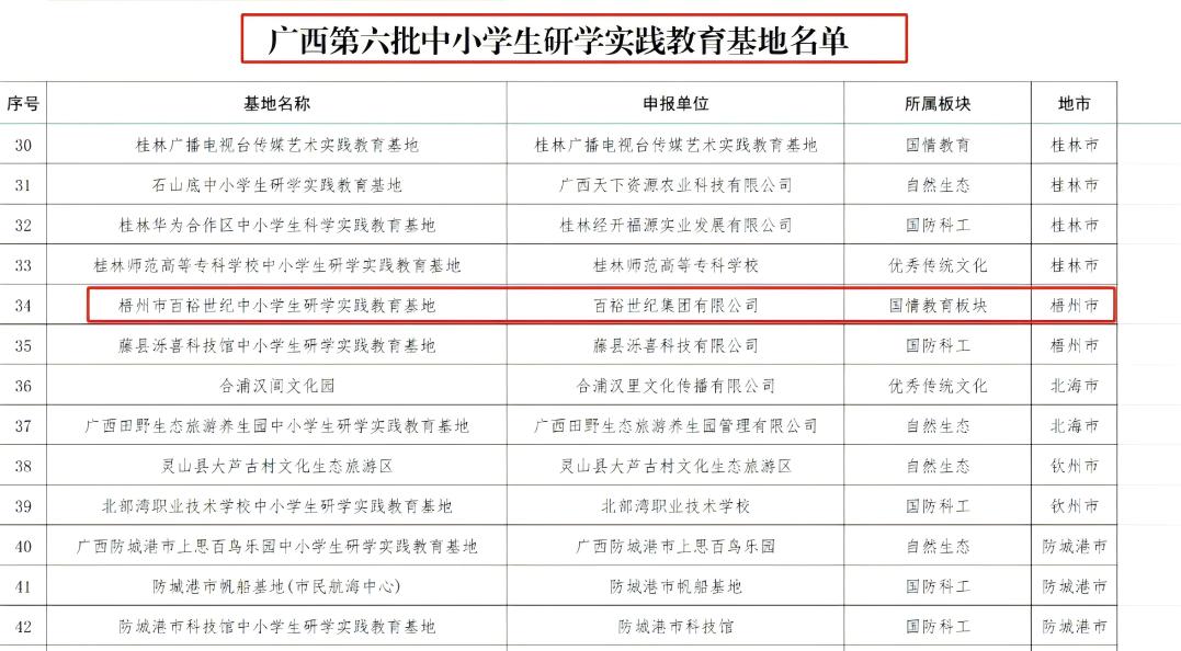 根據(jù)《自治區(qū)教育廳關(guān)于開展2024年全區(qū)中小學(xué)生研學(xué)實踐教育系列評選活動的通知》(桂教基教〔2024〕13號)要求,自治區(qū)教育廳組織各地開展廣西第六批中小學(xué)生研學(xué)實踐教育基(營)地和2024年中小學(xué)生研學(xué)實踐教育精品課程(線路)申報推薦工作。百裕世紀(jì)(集團(tuán))有限公司入選廣西第六批中小學(xué)生研學(xué)實踐教育基地名單。